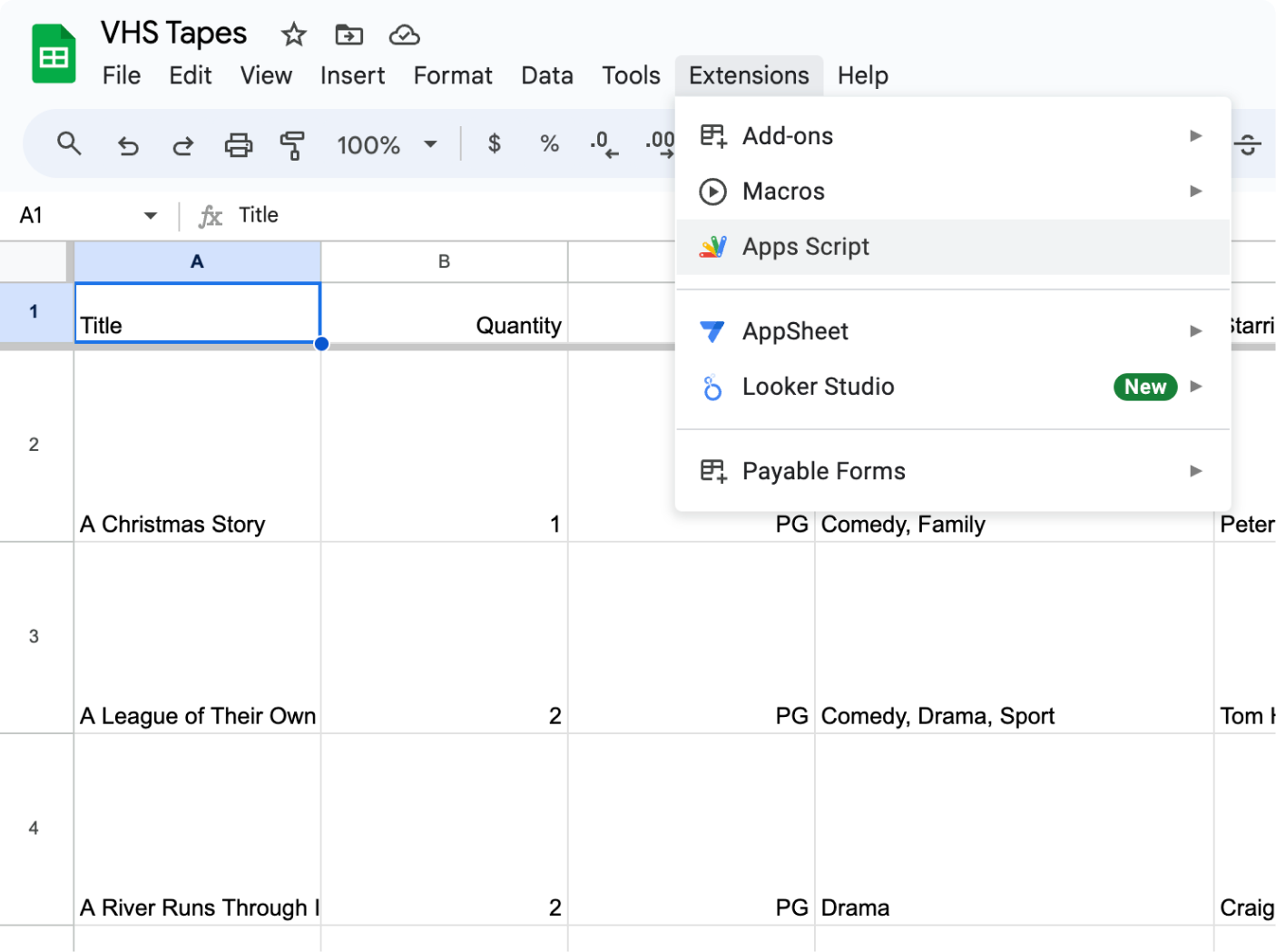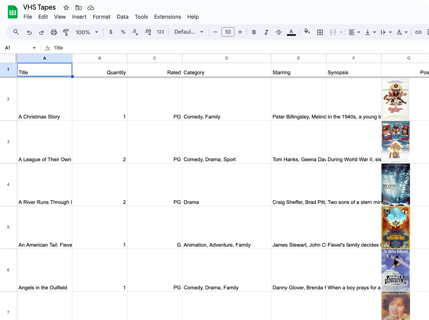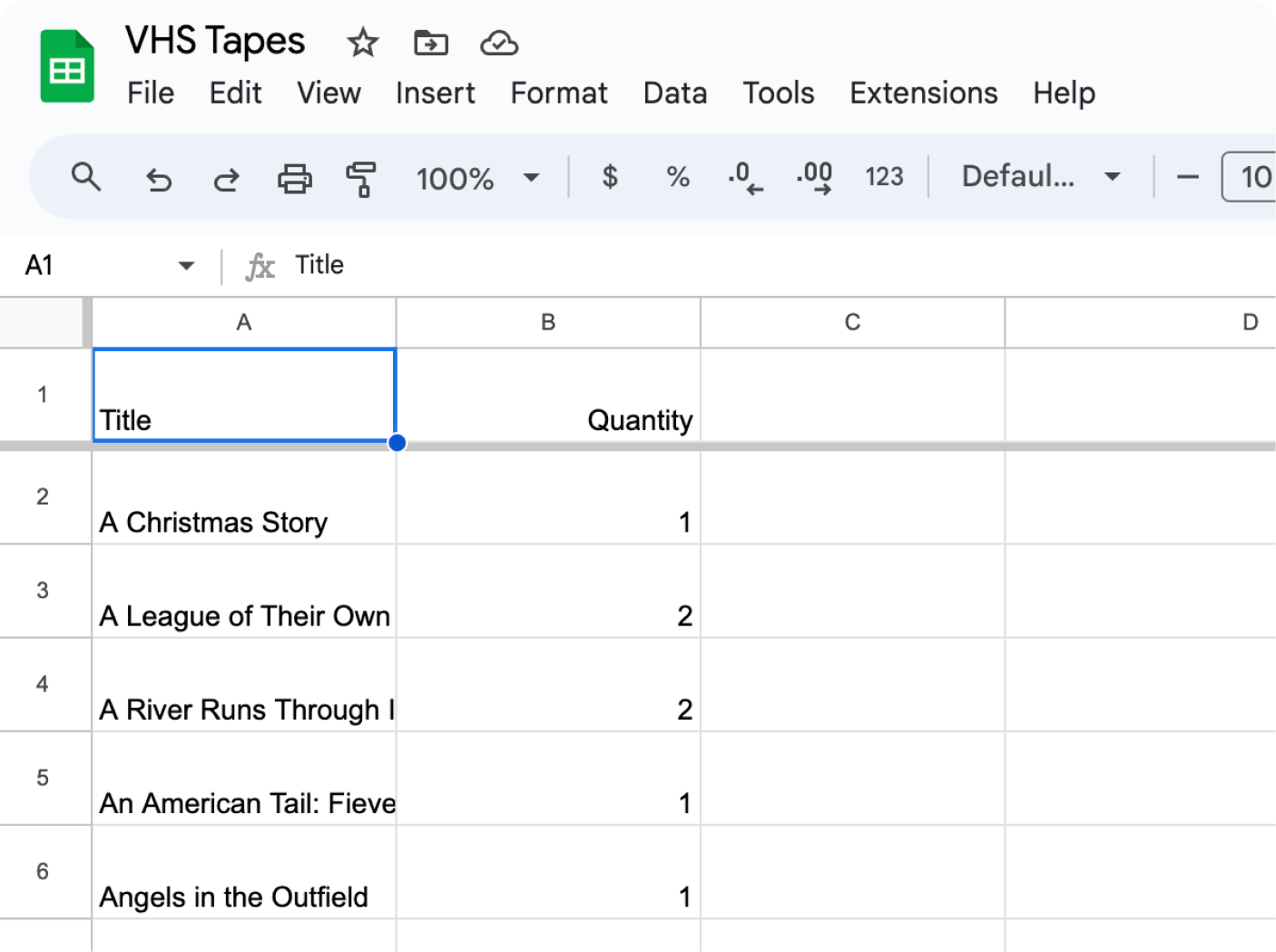 To get started, I inventoried all the tapes in a Google Sheet. Just a simple list of each title, along with the amount of copies I'd bought of each (remember that? Entire rows of the same tape? Titanic, anyone?).