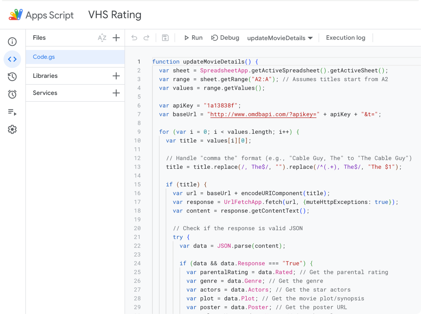 If you've never coded with ChatGPT, it's pretty simple, especially if you keep testing and replying with more specific fixes and features. In just a few minutes, we had a script that would hit the OMDB API, run thru my list of movie titles in the spreadsheet, and return the following data, each in an organized column: