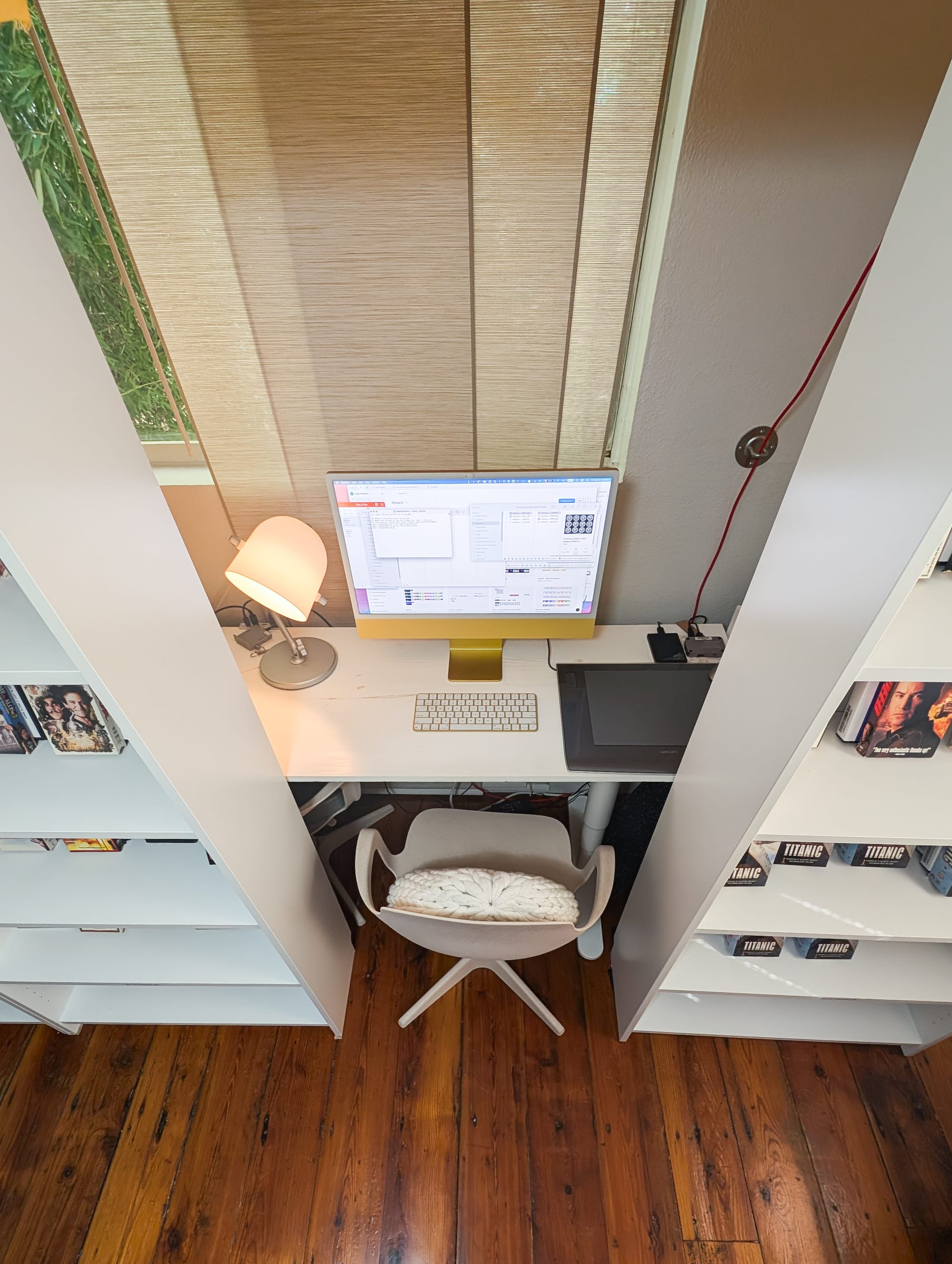Another funny look was the hidden desk behind the movie wall. To access the desk, we'd move a shelf in and out like a secret passageway in a movie.